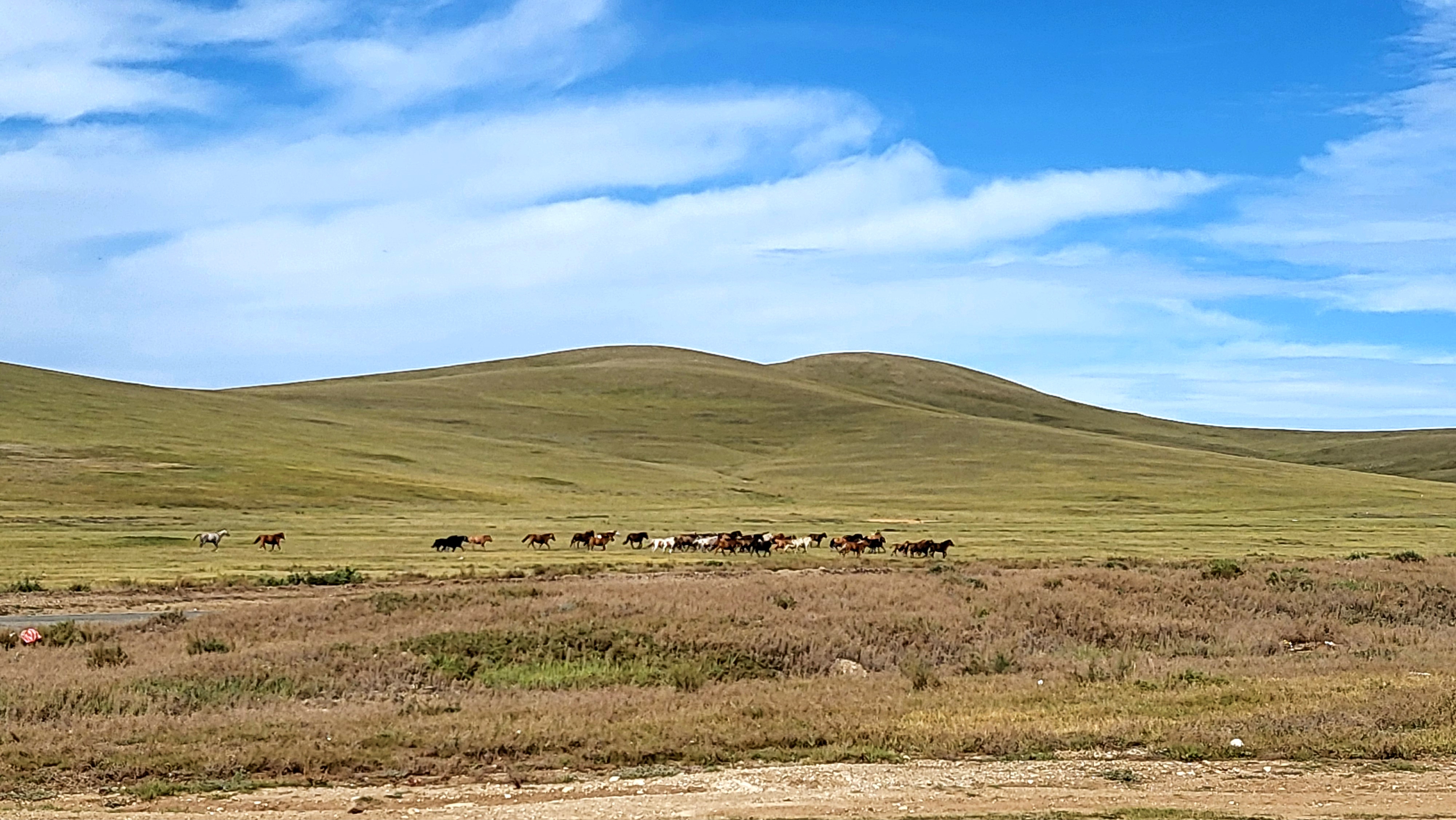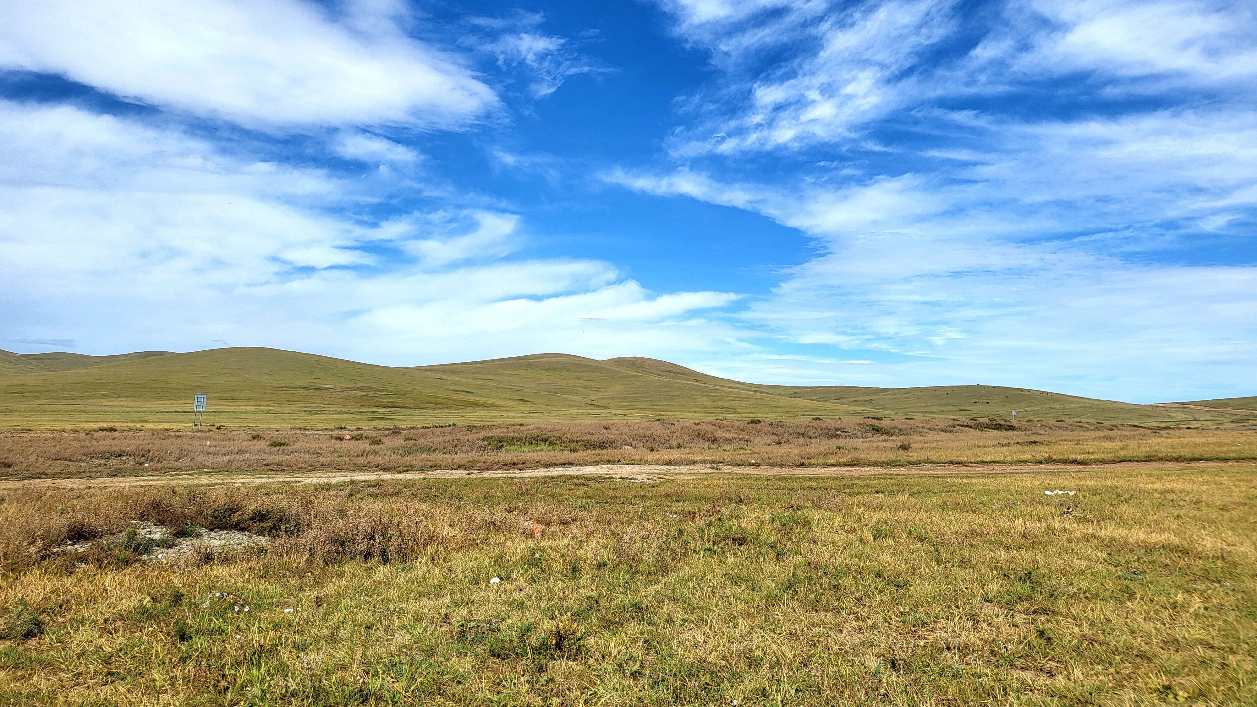 멀리 낮으막한 민둥산이 끊어질 듯 끊어지지 않고 이어져 갈 뿐, 넓은 초원이 펼쳐지면서 아무것도 시야를 막지 않으니 정말 시원하고 좋았다. 도로 사정이 안 좋은지 승차감이 없는 차량에서 흔들리는 것마저도 재미있게 느껴졌다.